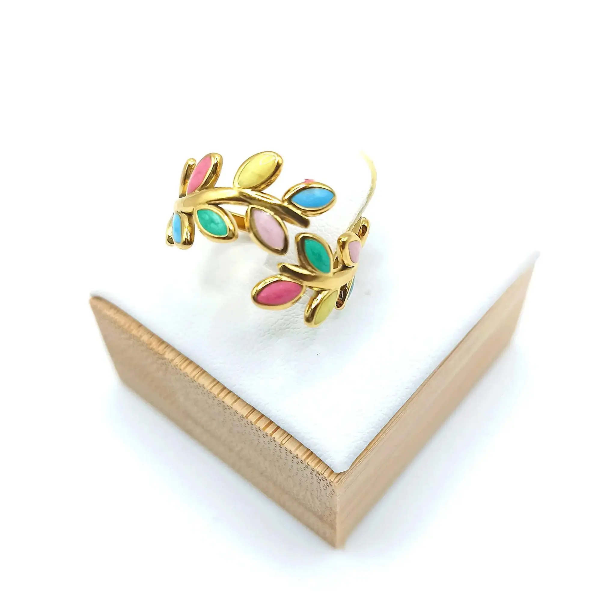 - Design Original : Une bague qui se distingue grâce à des feuilles multicolores sculptées avec soin.