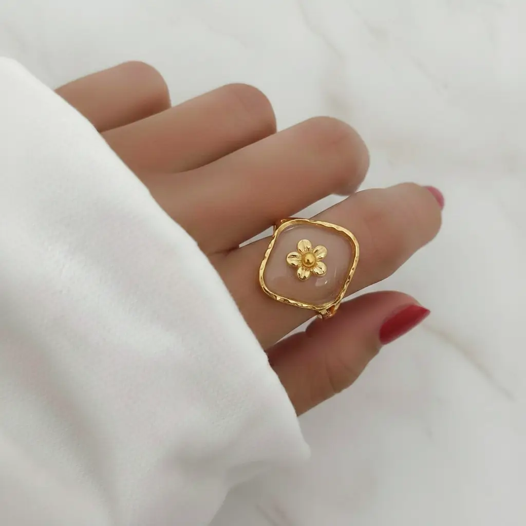 La Bague en acier inoxydable Fleur incarne la féminité et la douceur dans un design moderne et raffiné. Cette pièce unique associe une structure dorée en acier inoxydable à un centre transparent mettant en valeur une délicate fleur en relief. L’alliance subtile entre transparence et doré lumineux crée un bijou élégant, léger visuellement et résolument tendance.