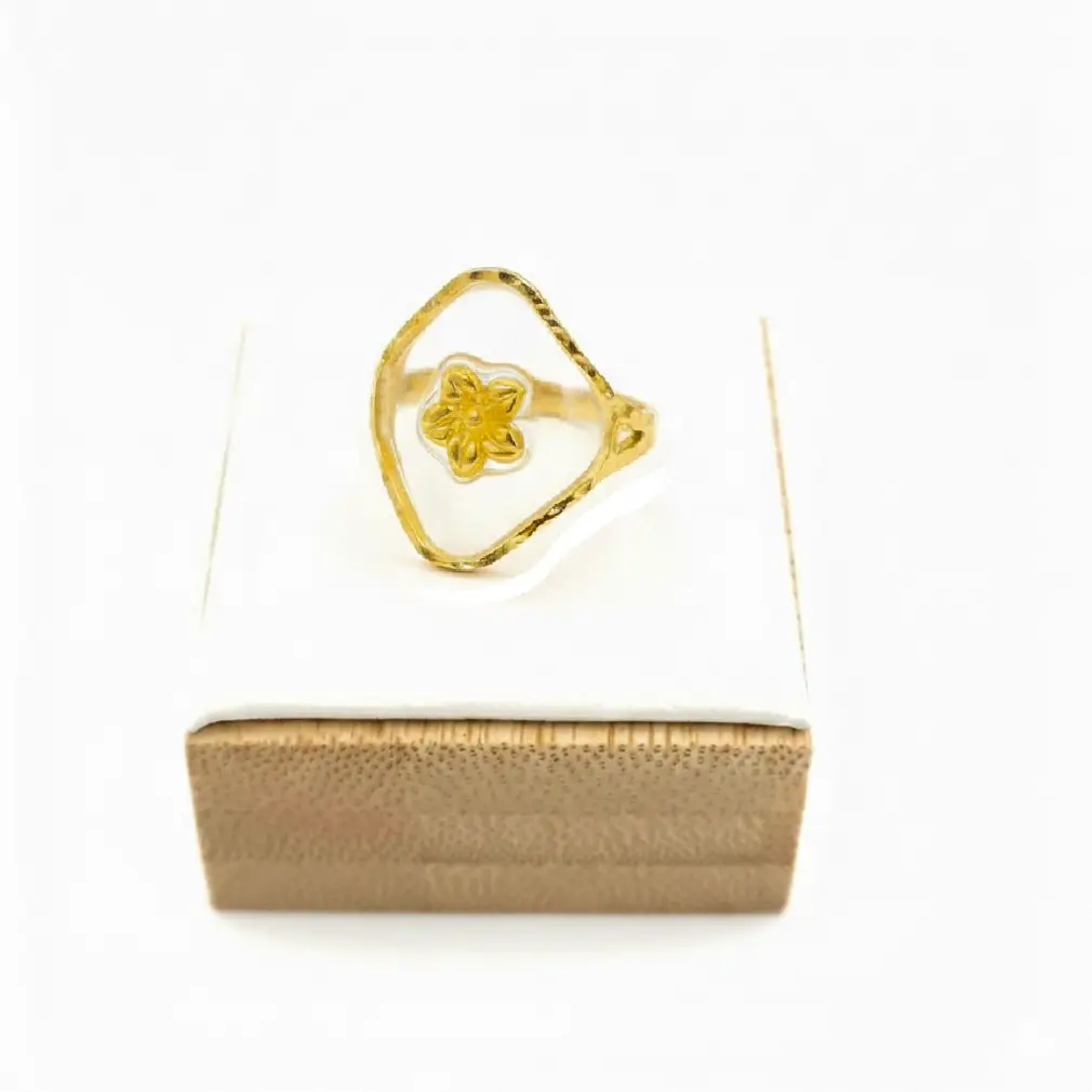 La partie centrale transparente entoure délicatement la fleur dorée, laissant passer la lumière pour un effet subtil et raffiné. Cette transparence apporte une touche contemporaine au bijou et met en valeur le motif central sans alourdir l’ensemble.