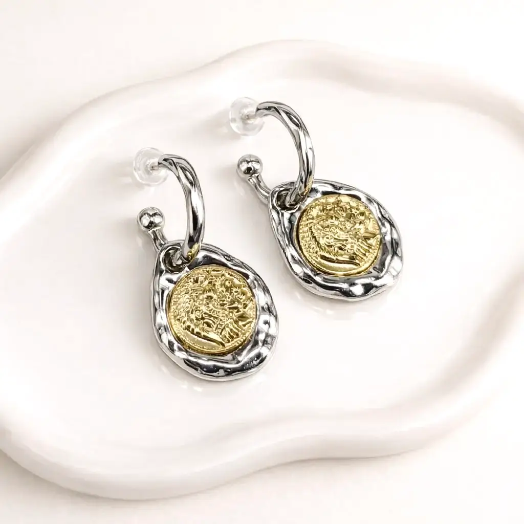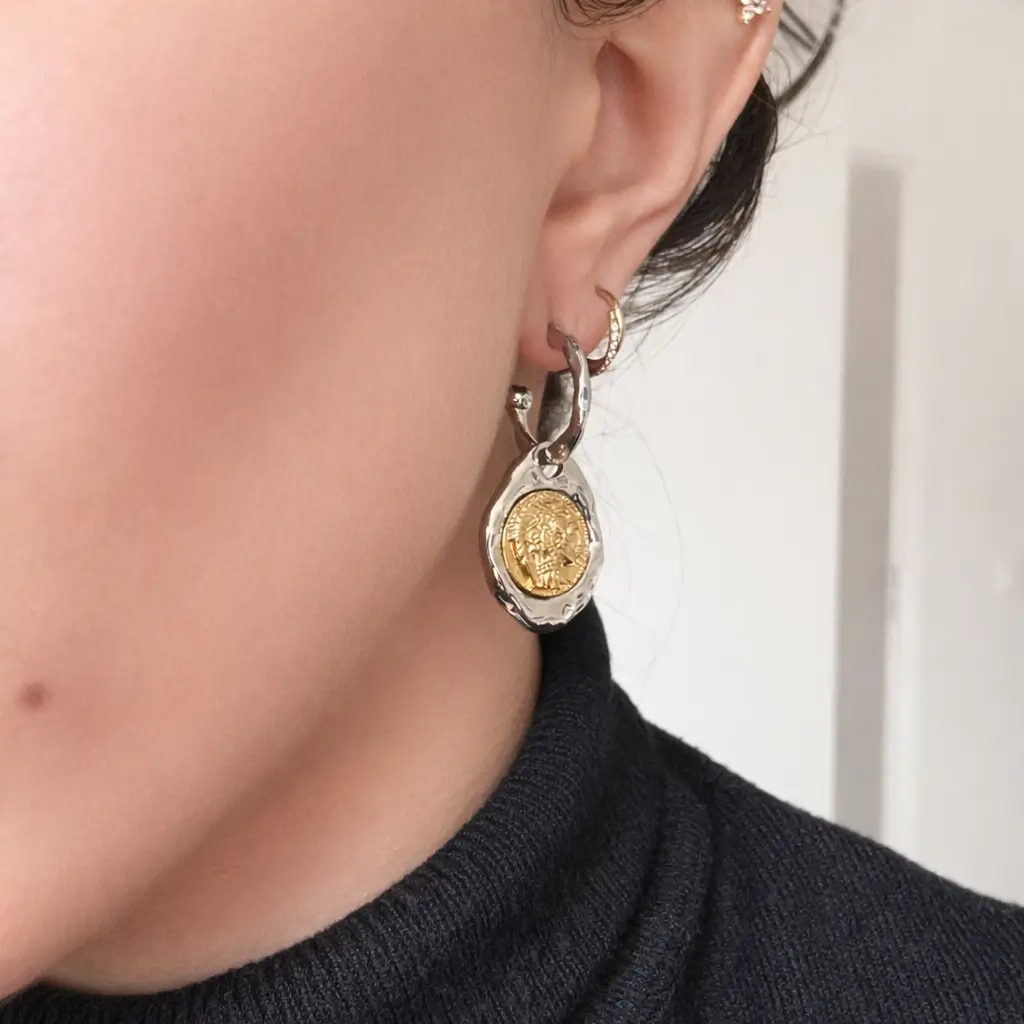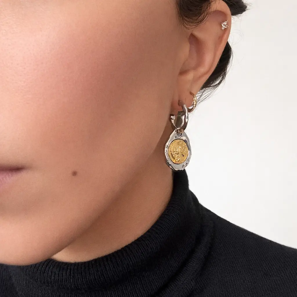 Le mélange entre la base argentée et le médaillon doré crée un bijou harmonieux, moderne et polyvalent. Ce contraste subtil permet aux Boucles d’oreilles Créoles Médaillon Antique de s’adapter à tous les styles et à toutes les carnations.