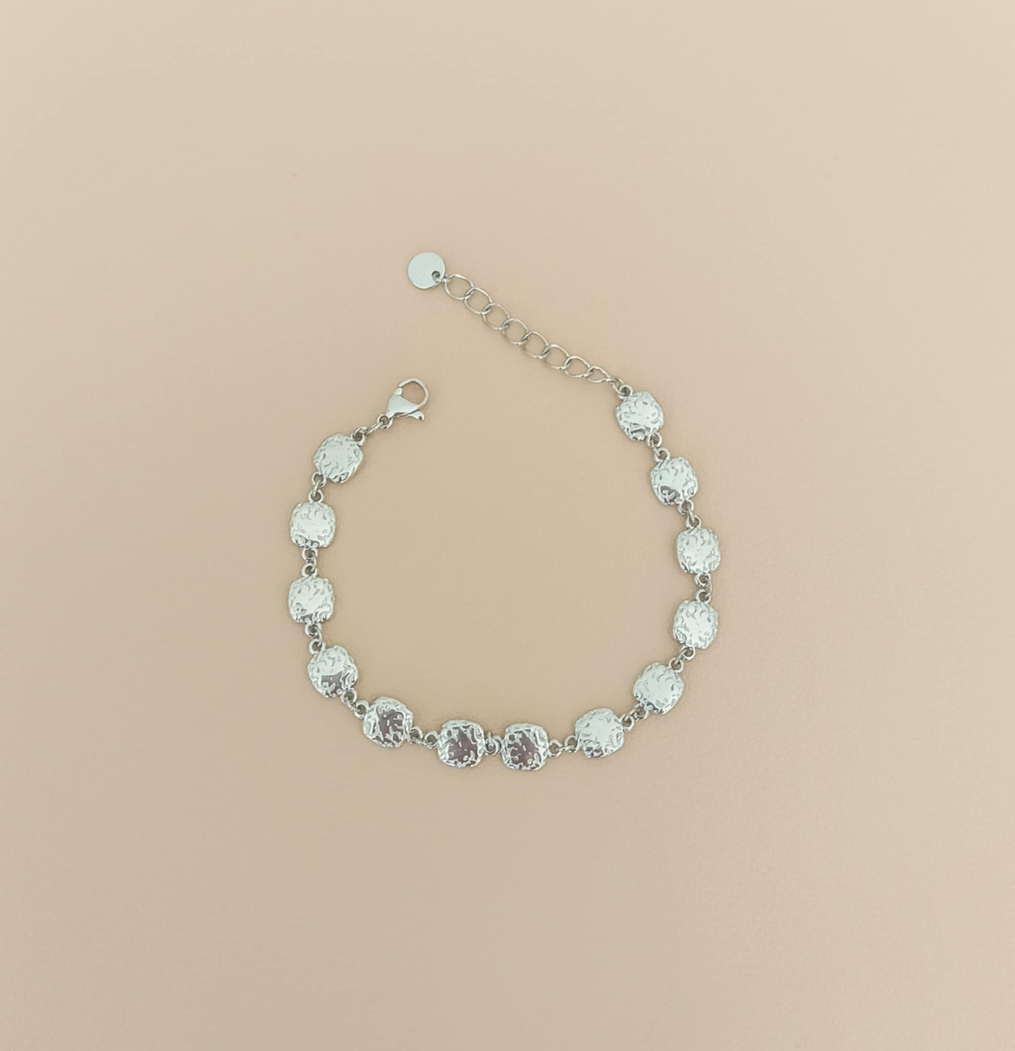 Le charme de ce bracelet réside dans ses petits carrés pleins et légèrement arrondis, qui créent un jeu de lumière unique et luxueux. Chaque carré texturé reflète la lumière différemment, offrant un rendu vivant et éclatant. La structure continue de la chaîne renforce le côté élégant et raffiné, tandis que la texture apporte profondeur et caractère au bijou.