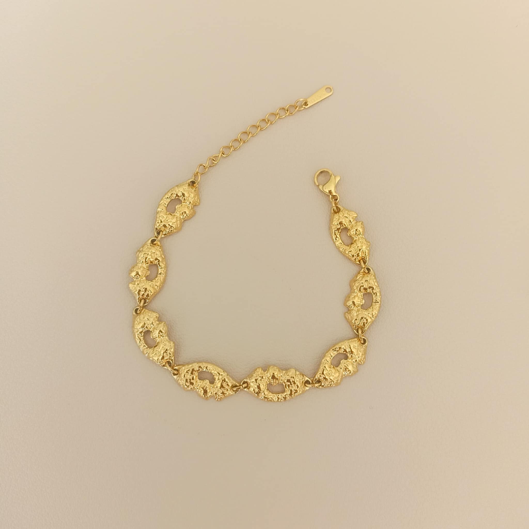 La véritable force de ce bracelet réside dans son originalité. Les maillons sculptés offrent une texture unique, créant un effet visuel captivant qui attire l’attention. Ce bijou n’est pas un simple accessoire : il devient le point central de votre style, capable de transformer une tenue simple en un look audacieux et sophistiqué.