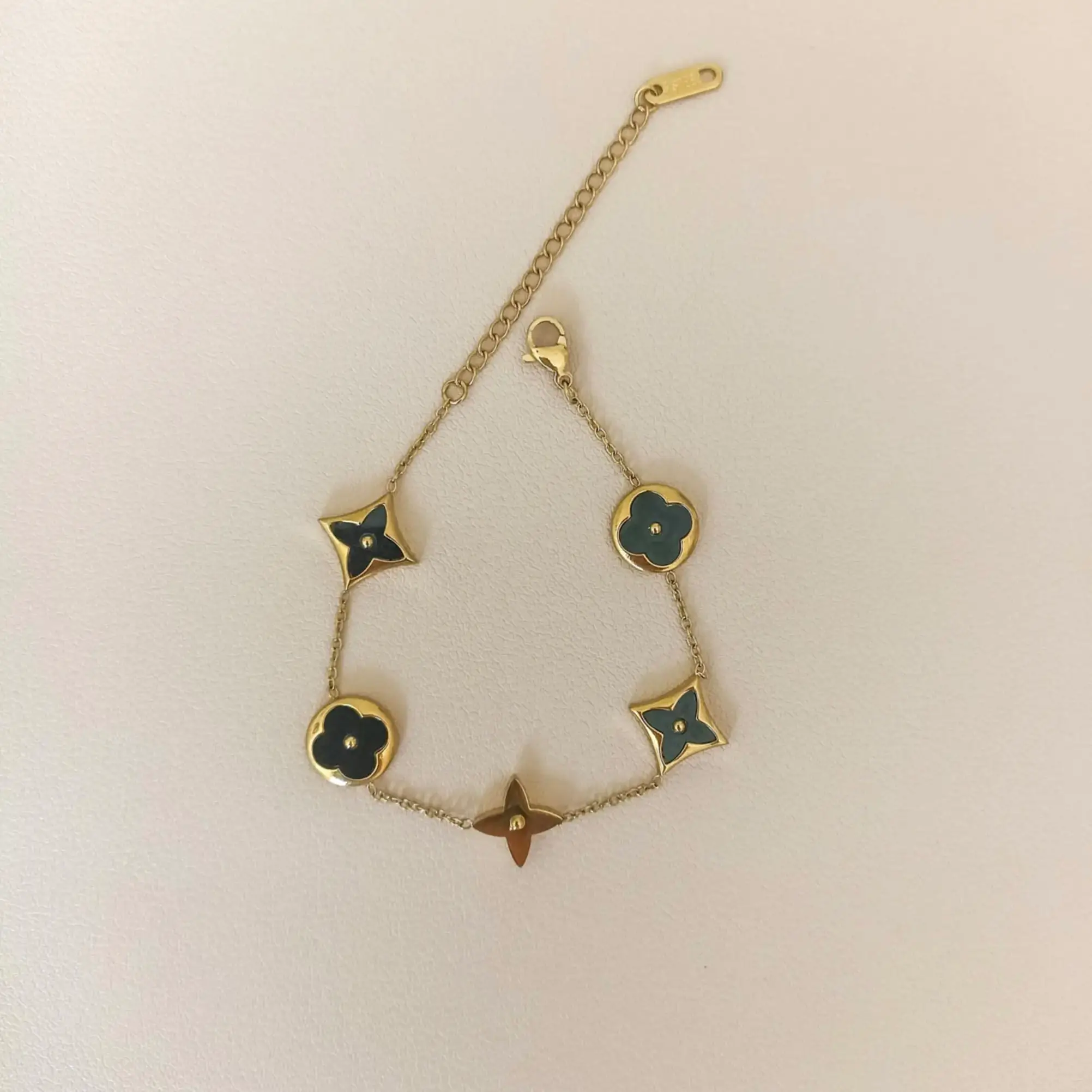 Le Bracelet Acier Inoxydable Nocturne se distingue par ses motifs floraux et étoilés délicatement travaillés, qui apportent une touche chic et féminine à toutes vos tenues. Son contraste entre le noir intense et les finitions dorées en fait un accessoire à la fois moderne et intemporel. Que vous soyez en soirée habillée, au travail ou simplement dans la vie de tous les jours, ce bracelet saura sublimer votre style.