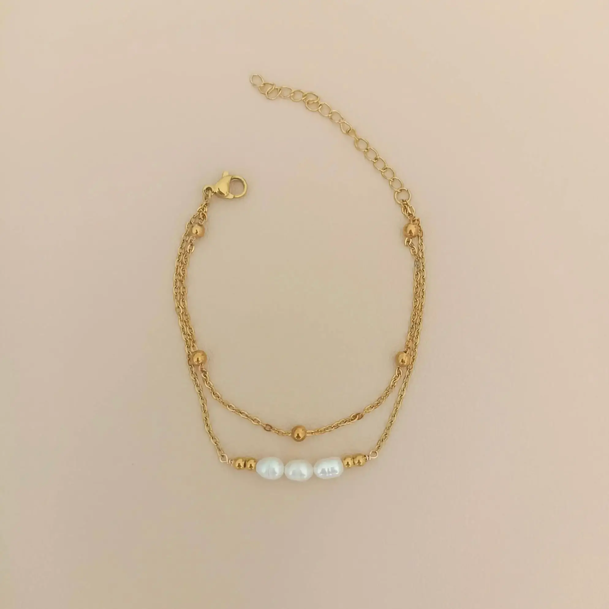 Les deux chaînes fines se superposent avec grâce : l’une rehaussée de petites perles dorées, l’autre ornée de trois perles naturelles d’eau douce soigneusement sélectionnées pour leur forme organique et leur éclat nacré.