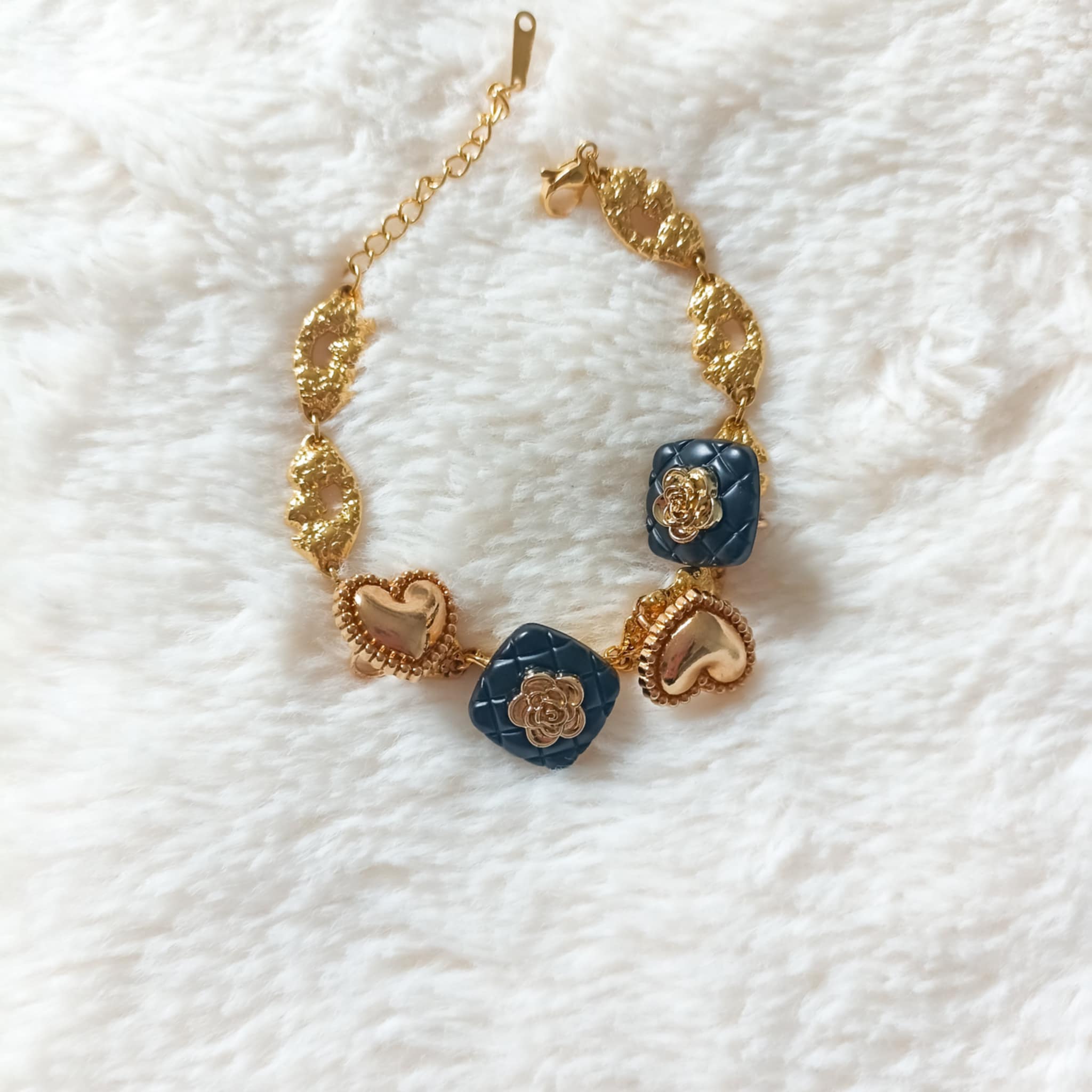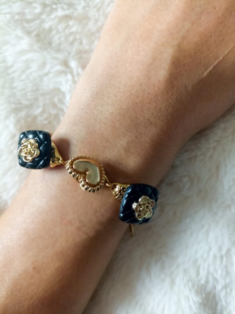 Pensé pour les amoureuses du style vintage, des finitions travaillées et des bijoux qui racontent une histoire, ce bracelet joue sur les contrastes de couleur et de forme : le noir des pastilles carrées effet matelassé, le doré éclatant des cœurs bombés et des roses centrales, la chaîne feuillage texturée qui évoque la nature stylisée de l’époque baroque… Chaque détail est pensé pour offrir une pièce unique et envoûtante.