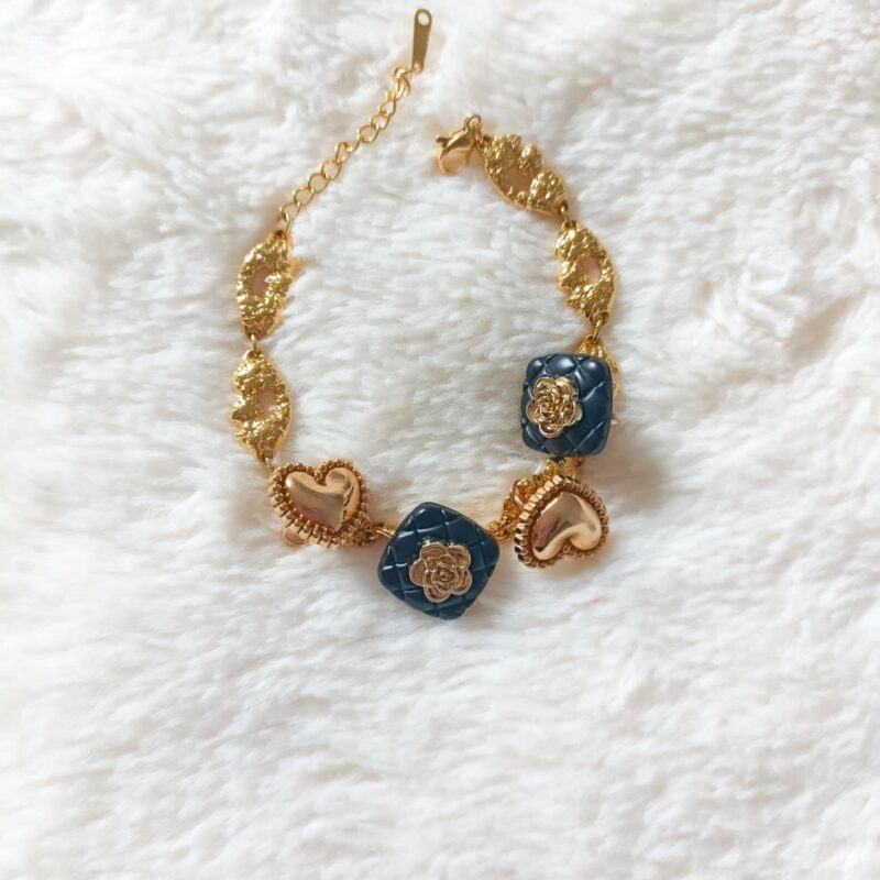 L’élément central du Bracelet Vintage Romance, ce sont ces carrés noirs à l’effet matelassé, inspirés des célèbres sacs de couture intemporelle. Chacun est orné en son centre d’une rose dorée en relief, finement sculptée et fixée avec précision. Ce contraste de texture entre le bleu profond et le doré lumineux crée une harmonie visuelle élégante et originale, parfaite pour un look habillé comme pour rehausser une tenue plus simple.