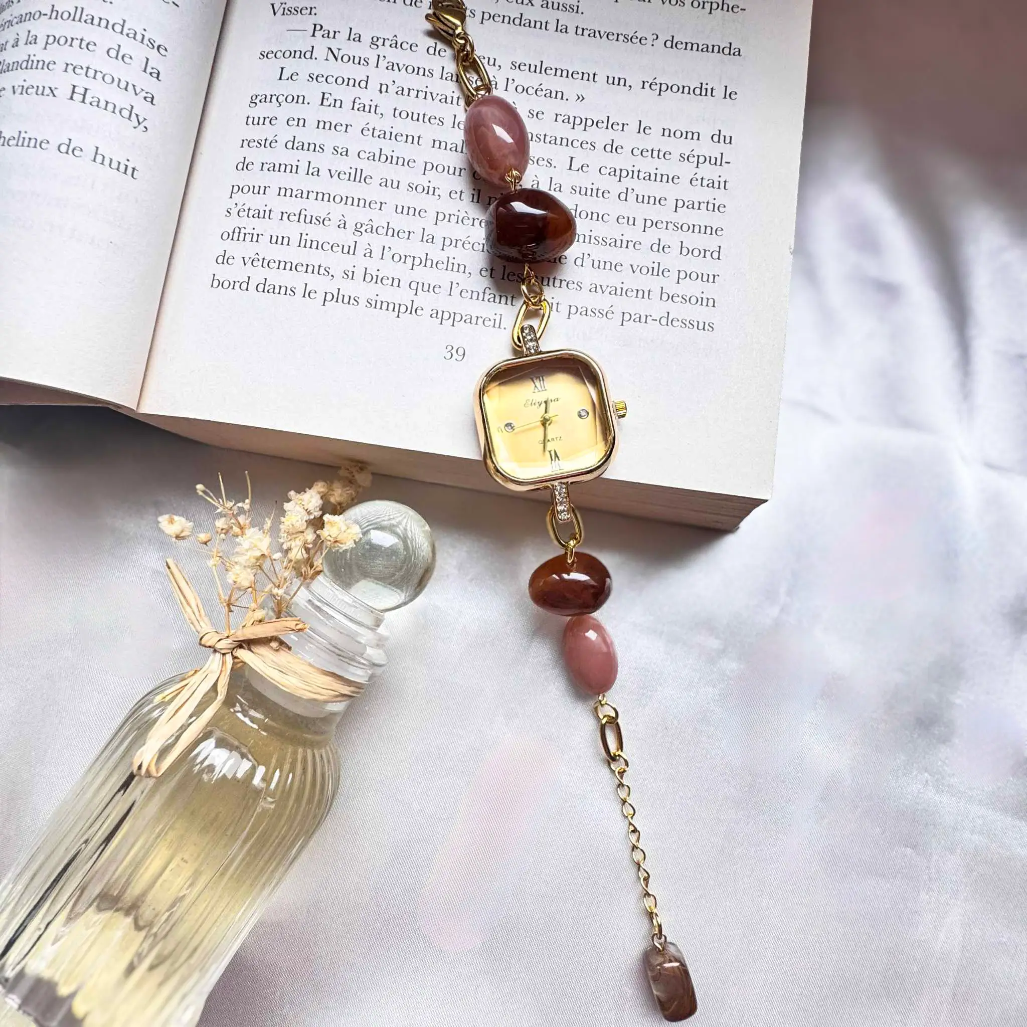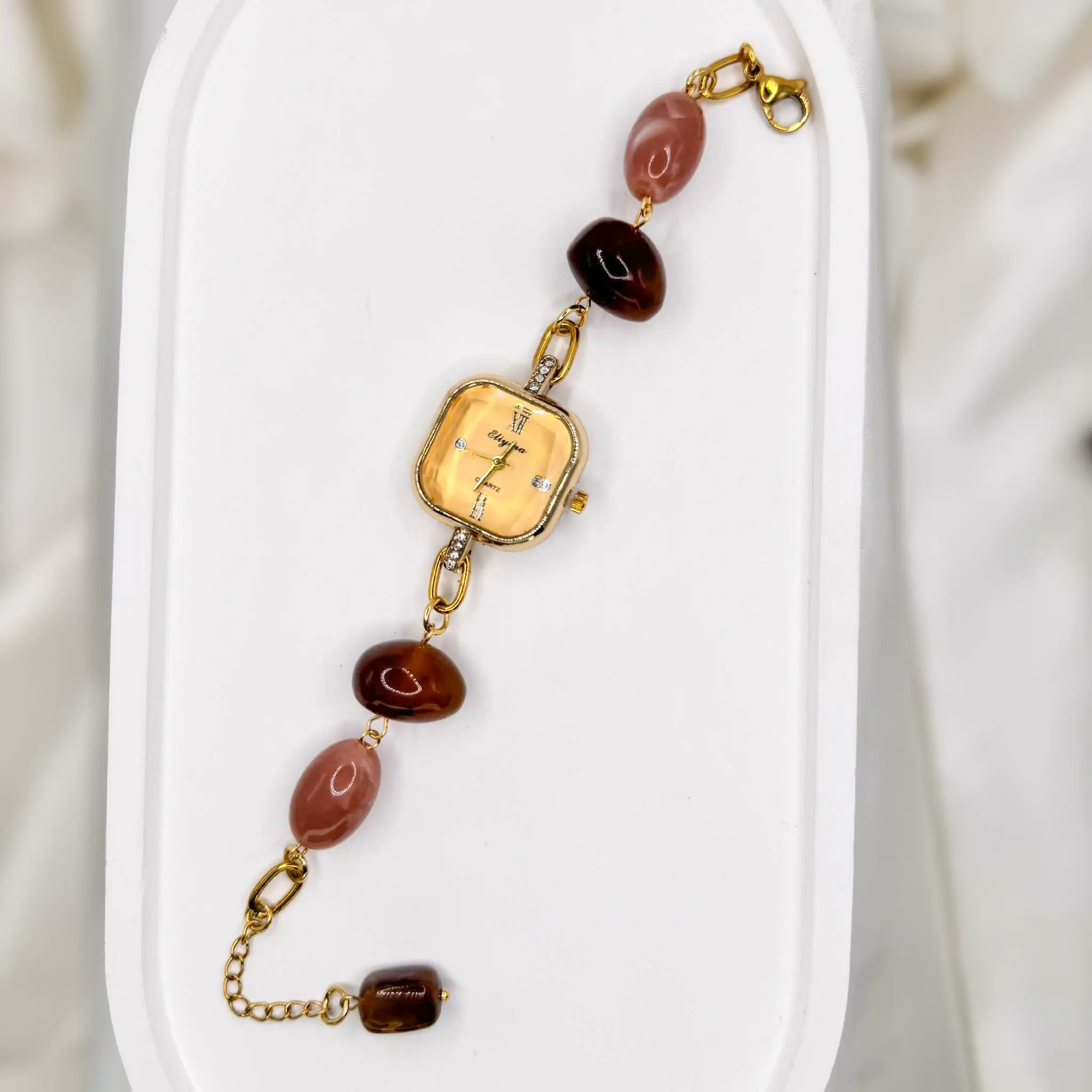 Le bracelet est orné de perles aux tons chauds, mêlant des nuances nude, rosées et brun ambré. Ces perles apportent une dimension minérale et naturelle à la montre, créant un contraste subtil avec la brillance du doré. Elles rappellent la douceur de la pierre ambre, source d’inspiration du modèle, et renforcent l’identité chaleureuse et féminine de la création.