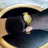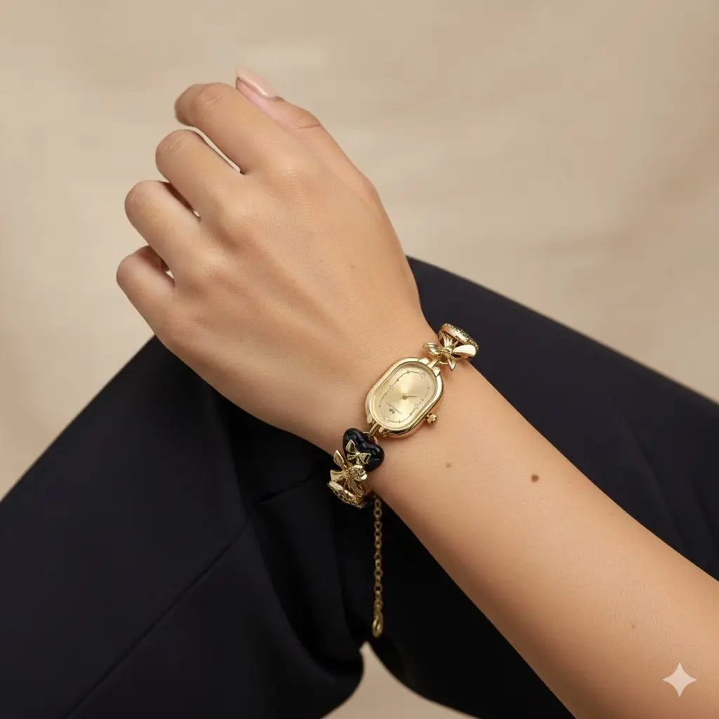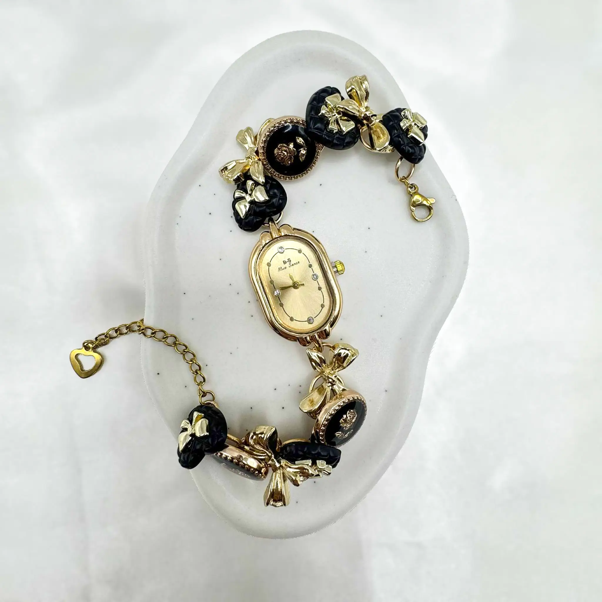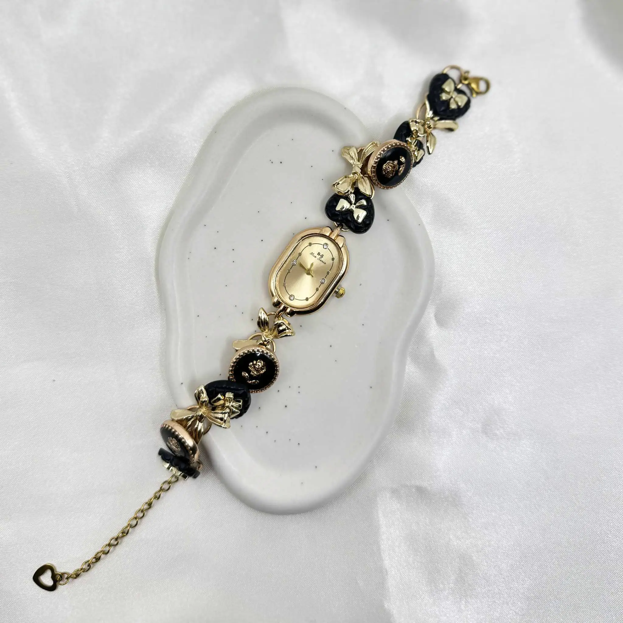 Chaque détail de cette montre a été imaginé pour sublimer le poignet avec finesse. Les boutons noirs brillants, délicatement ornés de motifs dorés en relief, créent un contraste saisissant avec la douceur du doré du bracelet. Cette association subtile entre le noir profond et l’or lumineux confère à la montre une allure chic, féminine et résolument vintage.