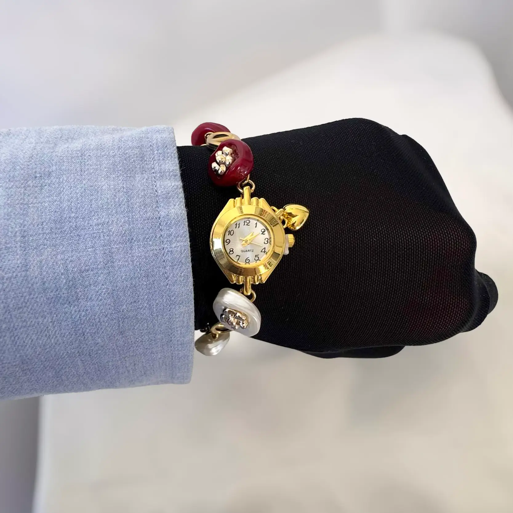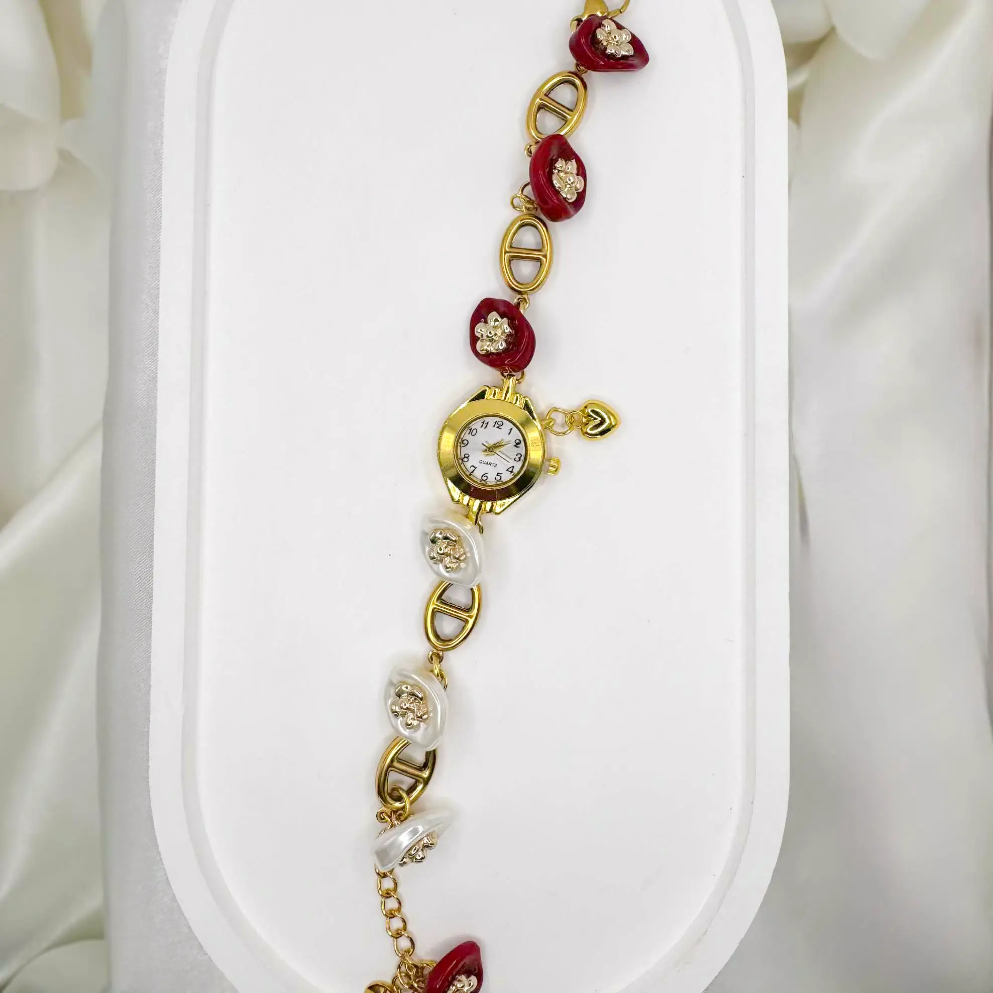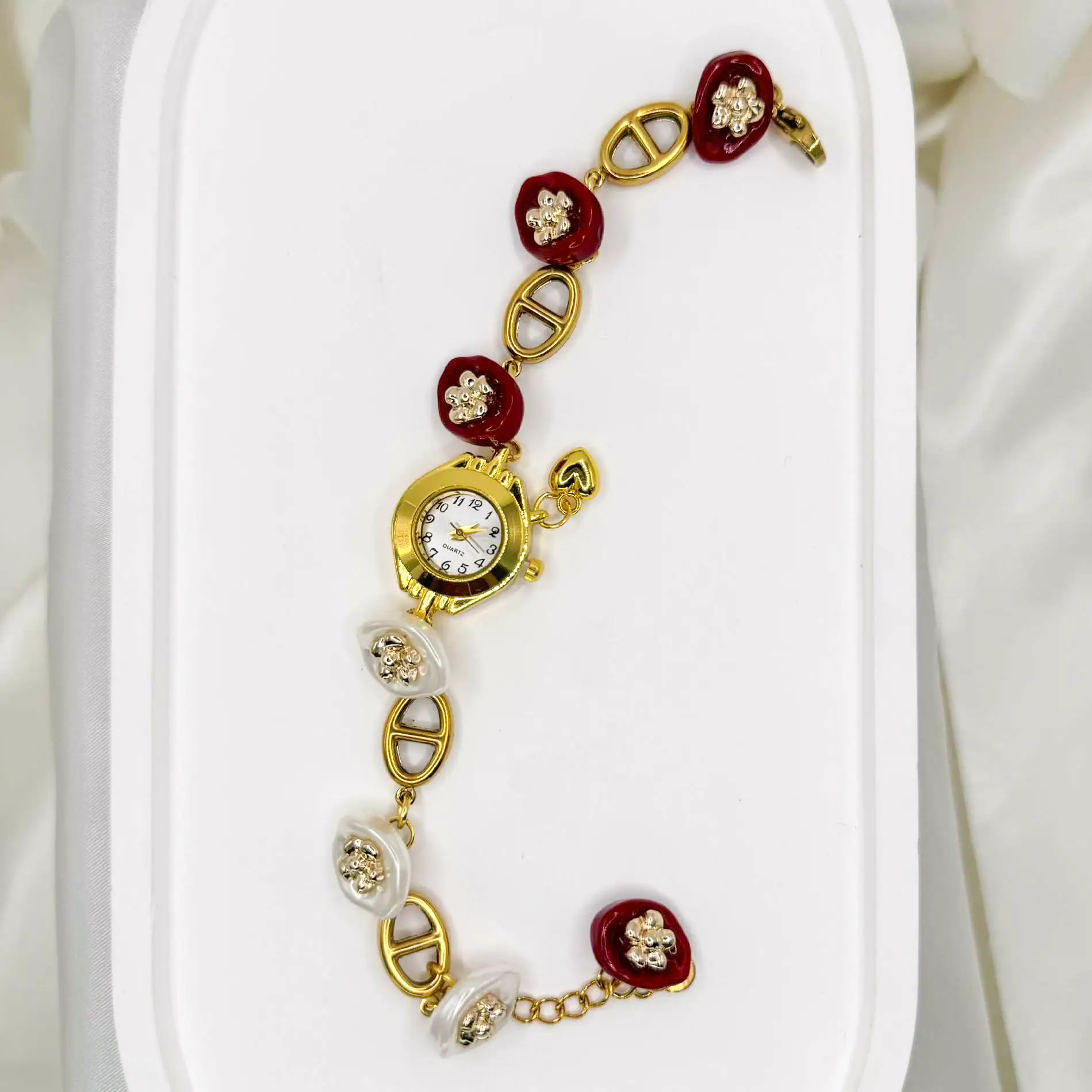 Montre artisanale en acier inoxydable, bijou floral bordeaux et blanc