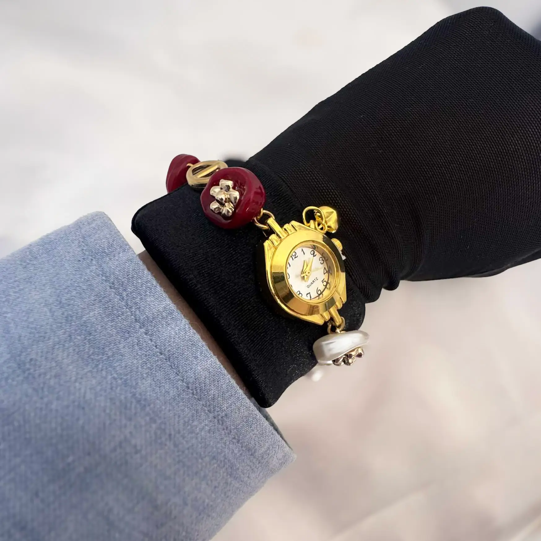 La tête de montre de la Montre Bracelet Dahlia provient d’une montre neuve, soigneusement extraite puis intégrée à cette création artisanale afin de lui offrir une seconde vie. Ce choix s’inscrit dans une démarche créative et responsable : transformer un élément existant pour donner naissance à une montre originale, élégante et sublimée par un nouveau bracelet bijou.