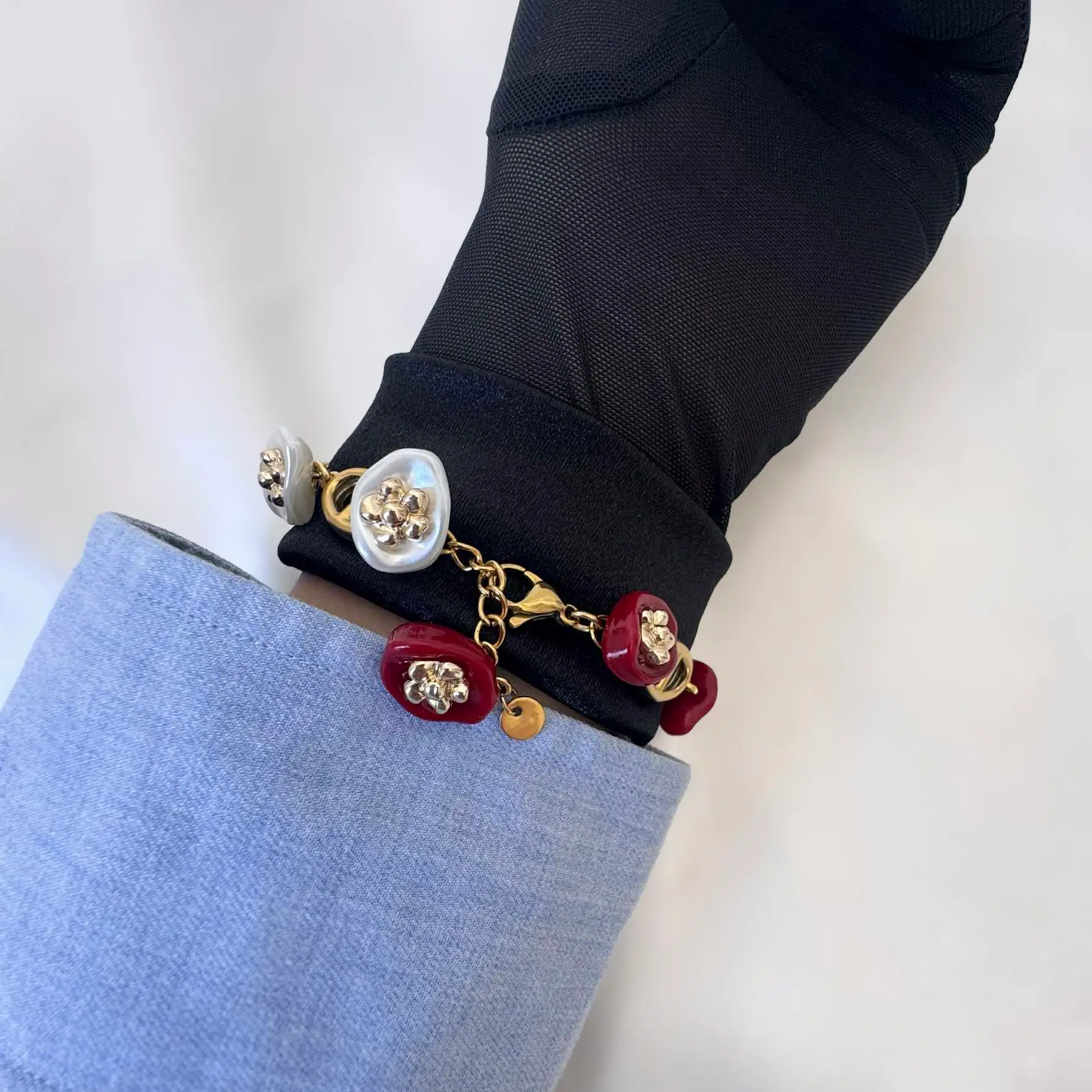 Les boutons décoratifs, aux nuances bordeaux profond et blanc lumineux, rappellent de délicates perles florales. Leur aspect évoque subtilement des pétales ou de petits bonbons précieux, apportant une touche à la fois poétique, féminine et originale à l’ensemble.