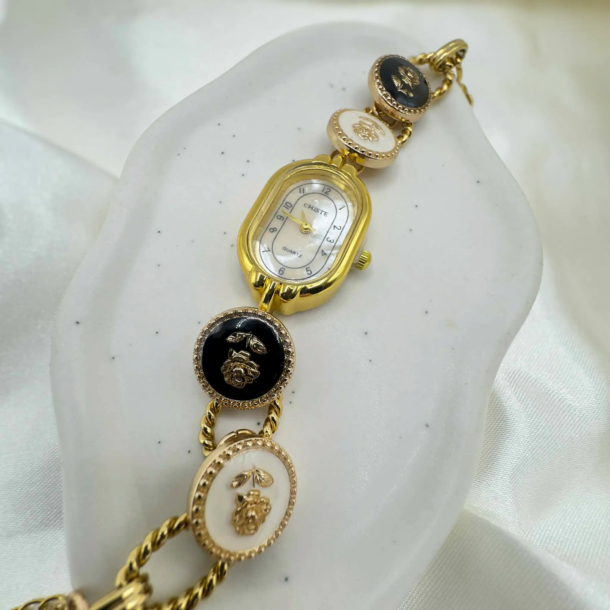 La Montre Bracelet Rose Retro se distingue par la délicatesse de ses boutons brillants noirs et blancs, sur lesquels se dévoilent de magnifiques roses dorées en relief. Ces détails captent immédiatement le regard. Leur lumière, subtile et raffinée, sublime chaque mouvement du poignet et apporte une touche résolument romantique. La rose, symbole de féminité, d’amour et d’élégance, apporte à cette montre un caractère précieux, poétique et intemporel.