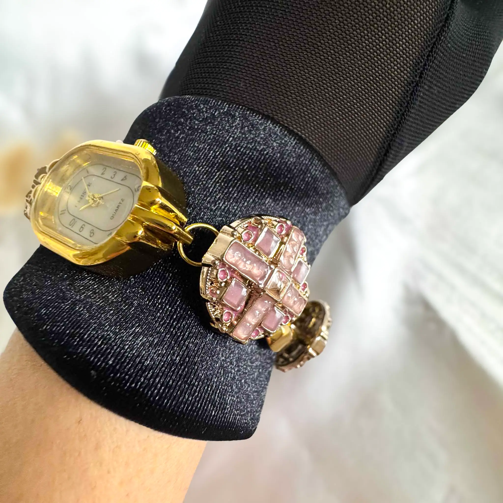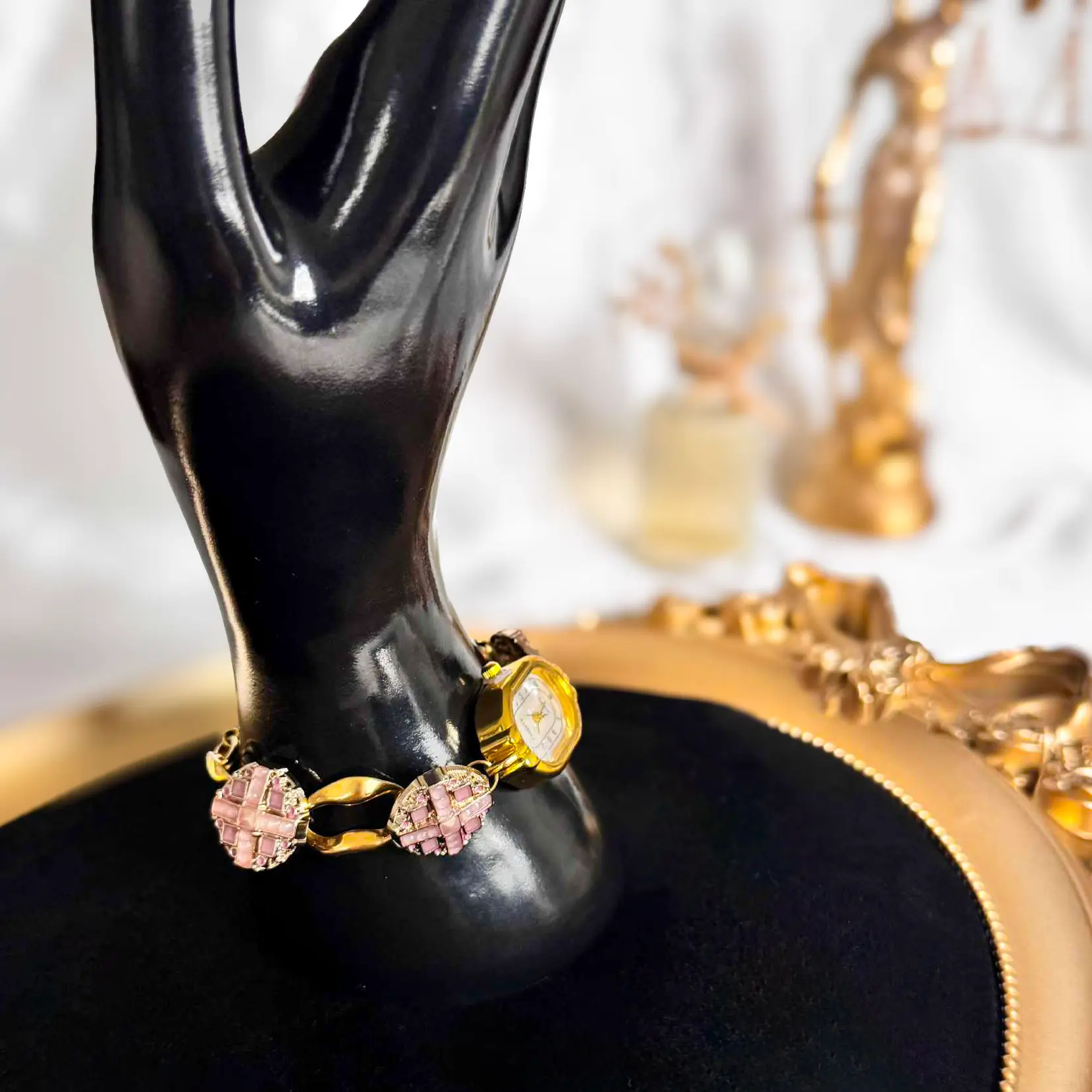 Les boutons rose qui ornent la Montre Bracelet Vintage – Boutons Rose sont de véritables boutons bijoux, inspirés de la haute couture vintage et de la bijouterie fantaisie des décennies passées. Leur teinte rose apporte une touche de douceur, de féminité et de raffinement, tout en renforçant le caractère rétro de la montre.
